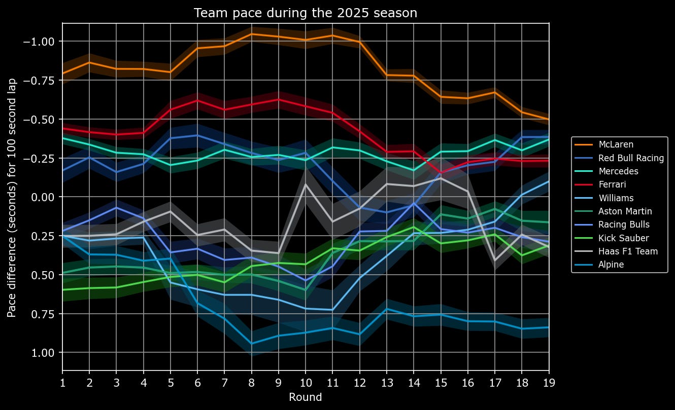 This is an estimate of the pace of each team relative to each other over the course of a season on a hypothetical circuit with an average lap time of 100 seconds. You can read more about the methodology for calculating this in my article about estimating the race pace of teams.